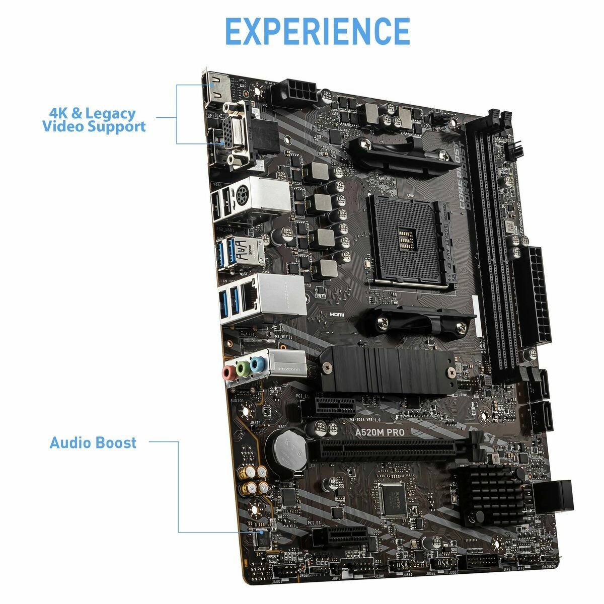 PRO series helps users work smarter by delivering an efficient and productive experience. Featuring stable functionality and high-quality assembly, PRO series motherboards provide not only optimized professional workflows but also less troubleshooting and longevity. M.2 SHIELD FROZR World’s fastest SSDs can start to lower performance when getting hot. Part of the motherboards heatsink design, M.2 SHIELD FROZR is the next generation M.2 thermal solution to avoid this by offering the best thermal protection to make sure that SSD maintains maximum performance. FULLY CONTROLLABLE IN BIOS AND SOFTWARE MSI motherboards let you manage speeds and temperatures for all your system and CPU fans. Total Fan Control allows you check your primary system characteristics in a simplified graphical interface. You can also set up to 4 temperature targets for CPU and motherboard, which will adjust the fan speeds automatically. EZ DEBUG LED Run into trouble? Onboard LEDs for key components will indicate the source of the problem so you know exactly where to look to get up and running again. ULTIMATE MOTHERBOARD PROTECTION Double ESD protection doubles up the grounding layer around the mounting holes, preventing static discharge surges from damaging the motherboard. FAST AND FUTURE-READY STORAGE MSI PRO series motherboards support all the latest storage standards, which allows users to connect any ultra-fast storage device. Higher efficiency makes your work easier. USB 3.2 GEN 1 Transfer lots of data, music and movies over USB easier. USB 3.2 ports are ready in both front and rear IO, provides wide variety of options to connect your USB 3.2 devices. MYSTIC LIGHT SYNC EXTEND YOUR RGB EXPERIENCE WITH EASE Add your color if you want! Mystic Light Extension pin header provides an intuitive way to control additional RGB strips and other RGB peripherals added to a system, without needing a separate RGB controller. JRAINBOW Connects 3-pin 5V Addressable LED strip JRGB Connects 4-pin 12V RGB LED strip PCB WITH 2OZ THICKENED COPPER An enhanced PCB design with 2oz thickened copper increases conductivity, improving heat dissipation and performance reliability especially during overclocking. A HUGE STEP OF DDR PERFORMANCE MSI OC LAB does not merely work hard on extreme overclocking. Compared to A320 motherboard memory A-XMP profile, MSI does have great improvement on performance and efficiency for A520 motherboards. Easy to enable A-XMP profile with auto power settings to get the best memory speed and stability. CORE BOOST Core Boost technology combines MSI's premium layout and optimized power design which allows for faster and undistorted current delivery to the CPU at pin-point precision. Not only supporting multi-core CPU, also creating the perfect conditions for your CPU overclocking.